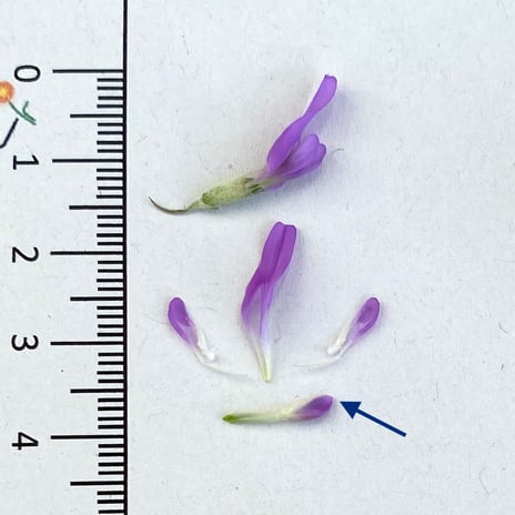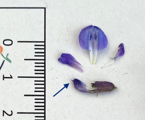 Nämlich auf die Spitze des Schiffchens (blauer Pfeil). Hat das Schiffchen vorne eine aufgesetzte Spitze - wir nennen es "Pupsspitzchen" ;-) - dann ist es ein Spitzkiel (Oxytropis). Ist hingegen das Schiffchen vorne stumpf, ohne aufgesetzte Spitze, handelt es sich um einen Tragant (Astragalus).