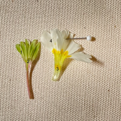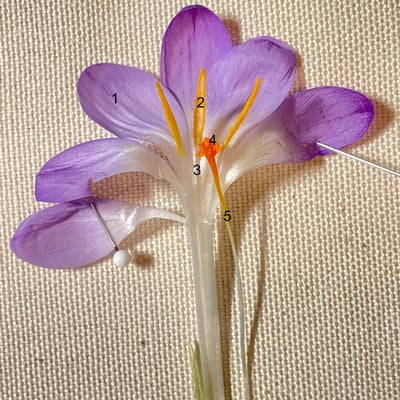 4. Kannst du alle nummerierten Organe benennen? Zum einen für die Primel-Blüte und zum anderen für die Krokus-Blüte? (Die Nummern entsprechen sich nicht, also ist z.B. Nr. 1 der Primel-Blüte nicht dasselbe wie Nr. 1 der Krokus-Blüte.