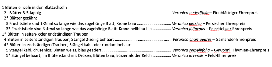 Weiter unten findest du einen unserer Vorschläge, wie die 6 Veronica-Arten in einem Bestimmungsschlüssel dargestellt werden können. Der Schlüssel ist angelehnt an den Bestimmungsschlüssel in der Flora Helvetica App (Version 2.3.1 2022).
