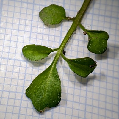 Schau dir die nächsten zwei Fotos an. Sind die Blätter behaart? Falls ja, mit welchen Haartypen? Sind es einfache Haare? Oder gegliederte Haare (z.B. Gabelhaare oder Sternhaare). Die Haartypen spielen, wie die Blattteilung, eine wichtige Rolle bei der Bestimmung der Brassicaceae-Gattungen.