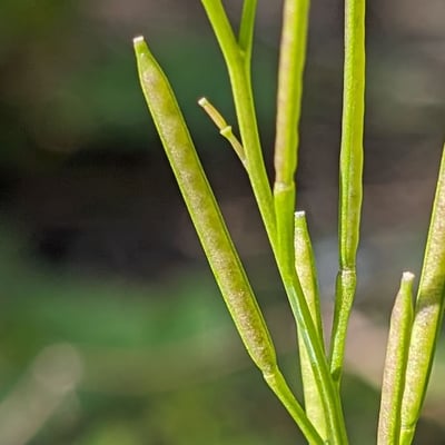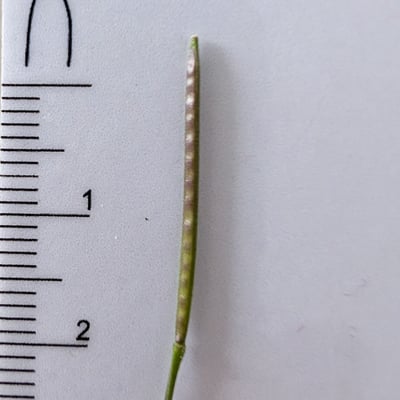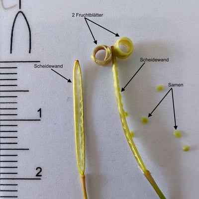 Die Frucht ist eine Schotenfrucht. Eine Schotenfrucht besteht aus zwei Fruchtblättern und einer dazwischenliegenden Scheidewand (siehe nächstes Bild). Schotenfrüchte, oder auch einfach "Schoten", sind typisch für die Familie der Brassicaceae (Kreuzblütler). Je nach Gattung können sie stabförmig sein wie im gezeigten Beispiel, oder abgeflacht wie beispielsweise bei den Mondviolen (Gattung Lunaria). Beim Kugelschötchen (Kernera saxatilis) sind sie gar kugelig. Die Fruchtform gibt demnach auch einen ersten Hinweis auf mögliche Gattungen.