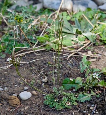 Typisch für die Rätselpflanze sind die weissen Kronblätter, die nur etwa 3 mm lang sind. Und dann ist da noch ein Merkmal, das atypisch ist für die Familie der Kreuzblütler. Denn normalerweise haben Brassicaceae-Blüten 6 Staubblätter. 2 plus 4, wobei die 2 "äusseren" etwas kürzer sind als die 4 "inneren". Unser Beispiel hat aber nur 4 Staubblätter. Die 2 vom äusseren Staubblattkreis fehlen. Genau dieses Merkmal ist typisch für eine ganz bestimmte Cardamine-Art. Weisst du für welche?