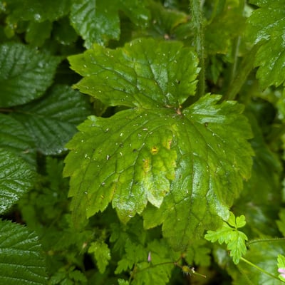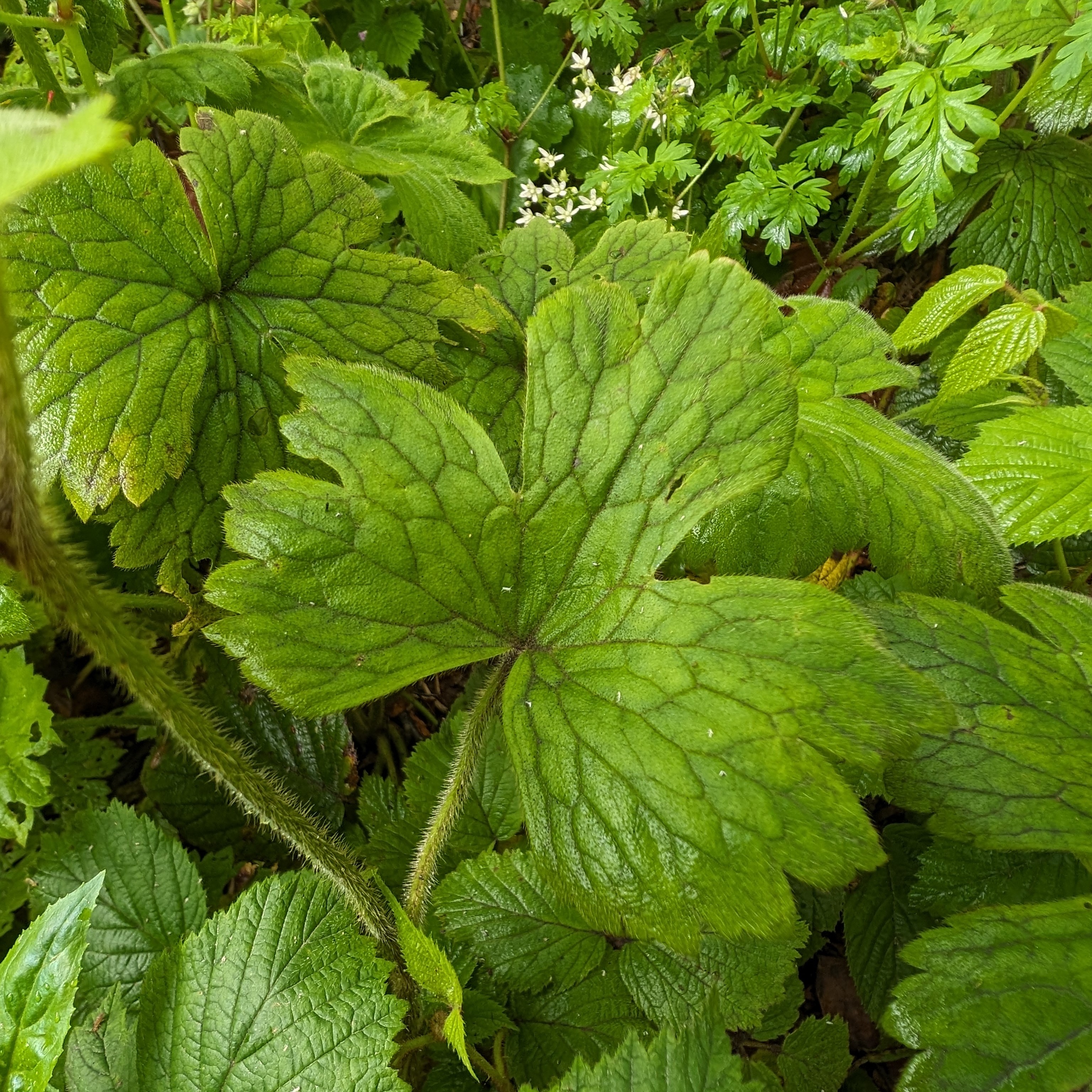Das radiär geteilte Blatt ist bis über die Mitte 3teilig und dicht abstehend weichhaarig. Es fühlt sich gar wollig an, wenn man es anfasst.