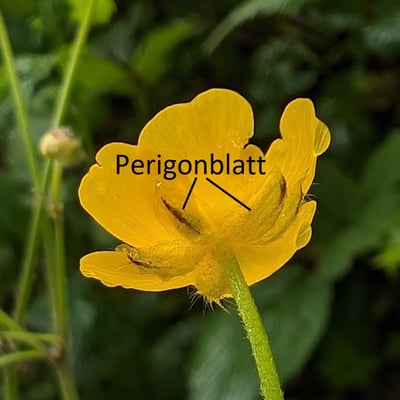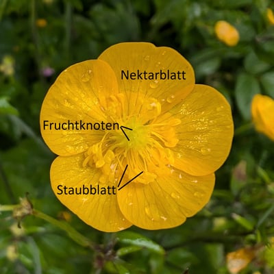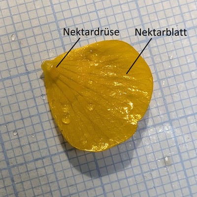 Der Typ Blütenblatt ist ein Nektar- oder Honigblatt. Diese weisen ein Nektarium oder eine Nektardrüse auf. Dieser Typ Blütenblatt ist typisch für die Familie der Ranunculaceae (Hahnenfussgewächse), kann jedoch auch fehlen, wie zum Beispiel beim Buschwindröschen (Anemone nemorosa). Je nach Gattung können sie wie im gezeigten Beispiel kronblattähnlich und grösser sein als die eigentlichen Blütenblätter, die in dieser Familie auch Perigonblätter genannt werden. Oder sie können einen Sporn aufweisen wie beispielsweise bei den Akeleien (Gattung Aquilegia). Bei der europäischen Trollblume (Trollius europaeus) sind sie gar schmal spatelförmig, von den kugelförmig zusammenneigenden Perigonblättern verdeckt. Die Form, Grösse und Farbe der Nektarblätter geben demnach auch einen ersten Hinweis auf mögliche Gattungen.