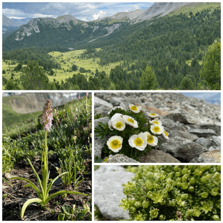 In dieser Woche lernst du einige der häufigen Alpenpflanzen vertieft kennen. Dafür durchwandern wir höhergelegene Regionen des Münstertals (Ofenpass, Umbrailpass, evtl. Lü) und nehmen Pflanzen aus subalpinen Nadelwäldern, Alpweiden, alpinen Rasen, Felsen und Geröllhalden unter die Lupe. Wir nehmen uns Zeit, um die Pflanzen im Detail anzuschauen, setzen uns hie und da für einen Moment hin, geniessen die alpine Landschaft und entdecken an den Pflanzen auch faszinierende Detailmerkmale, die von blossem Auge nicht erkennbar sind. So lernst du die einzelnen Arten mit ihren Merkmalen vertieft kennen und weisst nach dem Kurs einiges mehr als nur ihre Namen. Da wir die Arten stets im systematischen Kontext betrachten, kannst du auch dein Wissen zu Pflanzenfamilien und -gattungen festigen und erweitern. Ausserdem erfährst du Wissenswertes über das Gebirgsklima und wie es sich auf die Pflanzen auswirkt. Nebst den pflanzlichen Erkenntnissen und Entdeckungen erwarten dich genussvolle Momente in der wunderschönen Münstertaler Bergwelt und eine gute Zeit in lockerer Atmosphäre zusammen mit Gleichgesinnten.