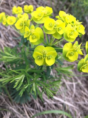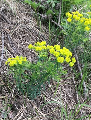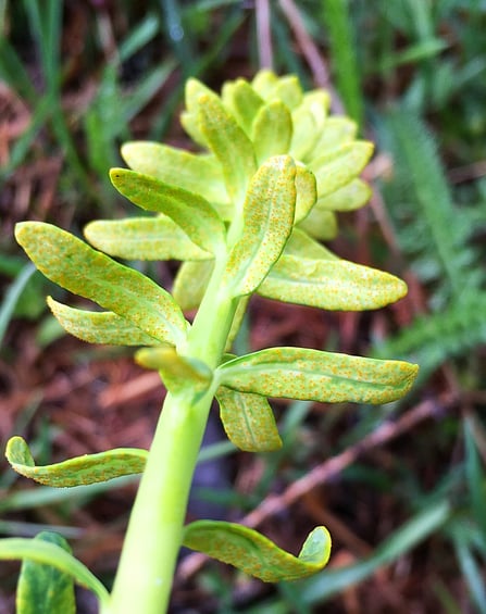 Was ihr im Bild (links und unten links) seht, ist eine Euphorbia cyparissias (Zypressenblättrige Wolfsmilch), die von einem Rostpilz befallen ist. Auf dem Bild unten Mitte und rechts ist eine nicht befallene Pflanze als Vergleich dargestellt.